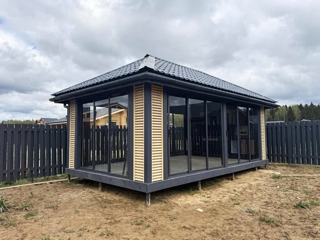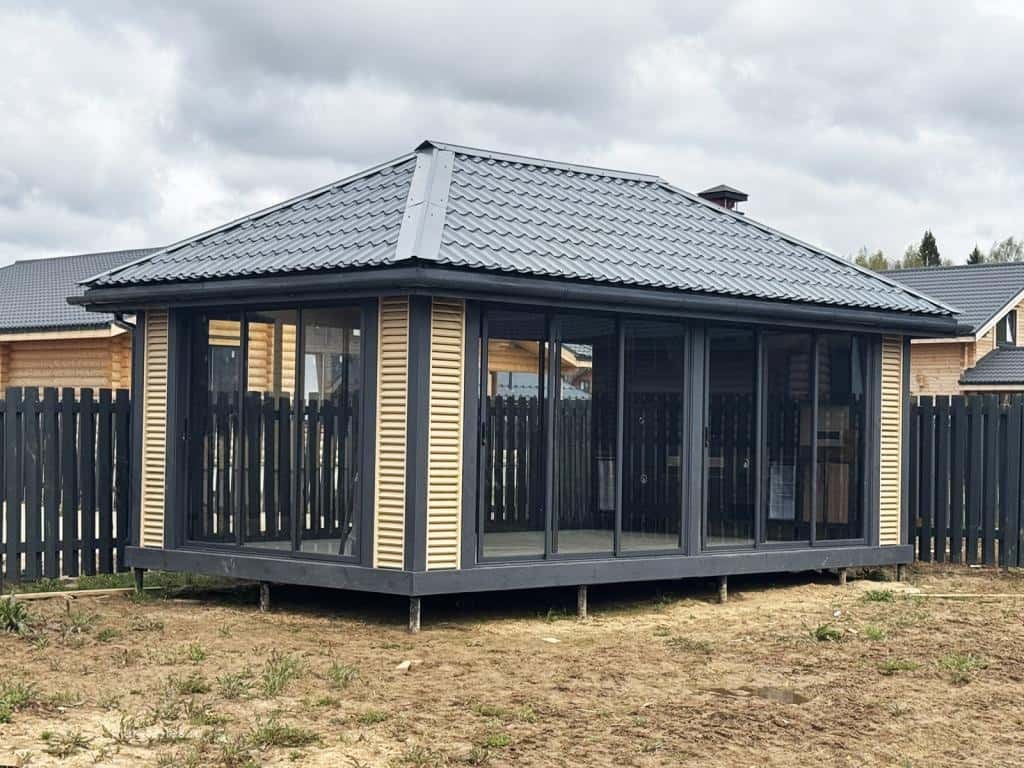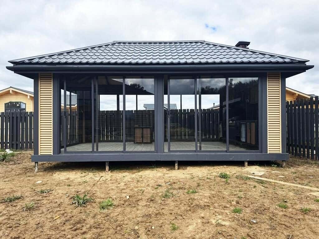 Внутреннее пространство полностью остеклено. Вы получаете максимум естественного освещения и круговой обзор участка, сохраняя при этом полную приватность и комфорт в любое время года. Здесь достаточно места, чтобы установить мягкую мебель, большой обеденный стол или организовать пространство для хобби.