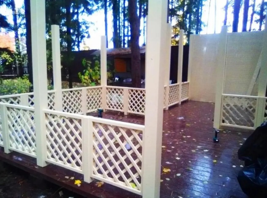 Беседка полностью открытая по низу — это даёт лёгкость и проветривание. Вы не чувствуете себя в коробке, но под крышей всегда сухо и есть тень. А высокий купол позволяет повесить свет и не биться головой.