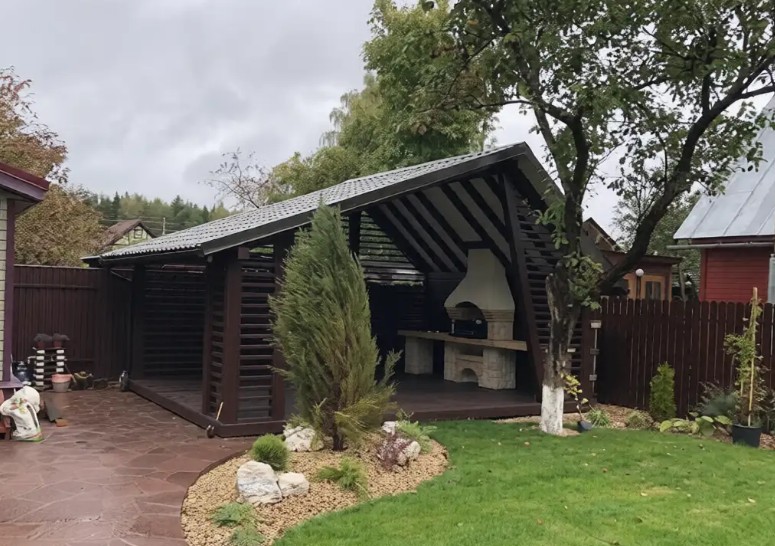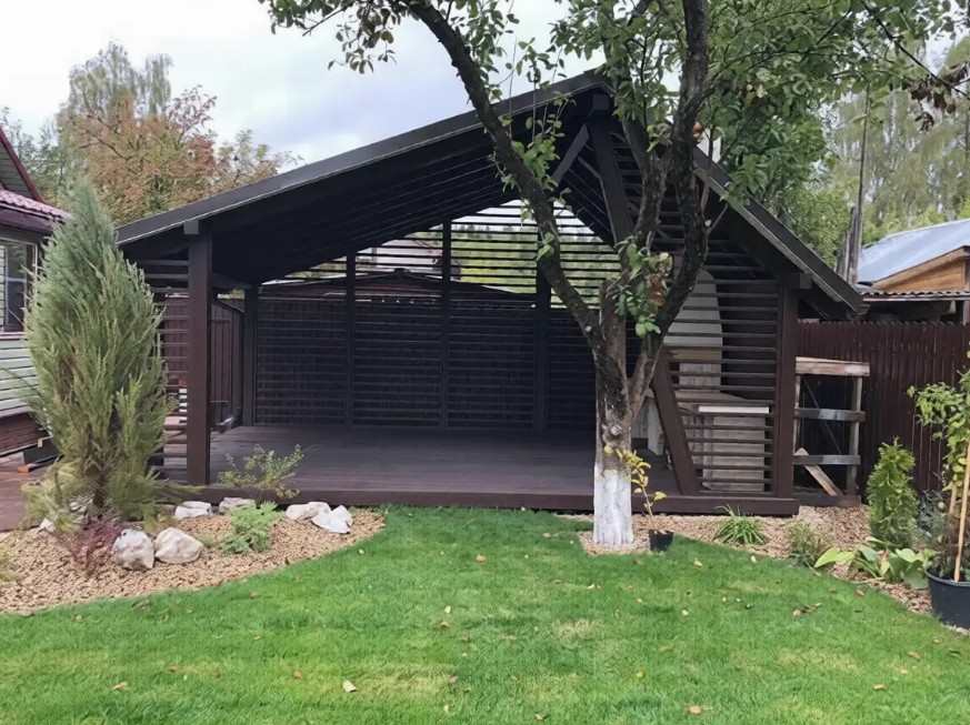 Беседка деревянная с барбекю 2601 — это решение для тех, кто ищет не просто навес на участке, а эффектное архитектурное решение. Необычный дизайн делает её настоящей изюминкой сада, где стиль встречается с функциональностью. Главное преимущество модели — продуманная эргономика: внутреннее пространство организовано так, чтобы с комфортом разместить и зону отдыха, и небольшую кухню с барбекю. Теперь готовить любимые блюда на открытом огне можно, не прячась от непогоды.