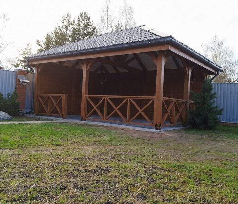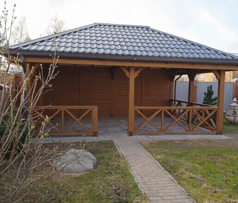 Подшив кровли выполнен из имитации бруса (136×16 мм), что придает внутреннему убранству беседки законченный, благородный вид с акцентом на натуральное дерево. В качестве финишного покрытия кровли используется надежная металлочерепица, а также доступны варианты на выбор: мягкая кровля, поликарбонат или стекло.