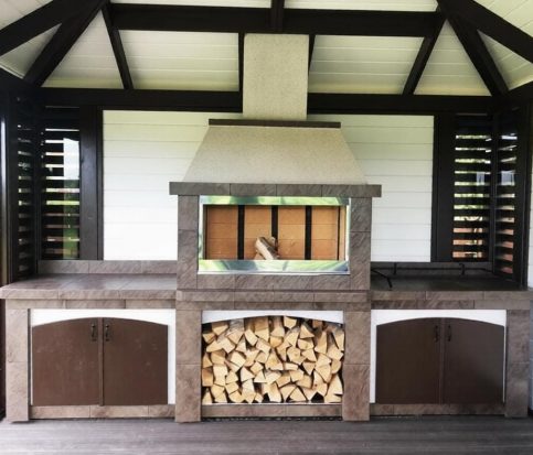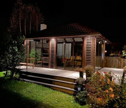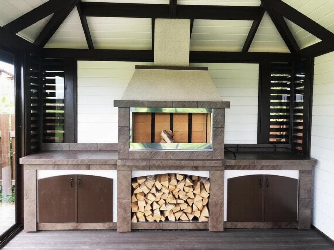 Остекление беседки выполнено в панорамном формате. Внутреннее пространство наполняется естественным светом, при этом вы полностью изолированы от осадков, пыли и назойливых насекомых. Встроенный комплекс барбекю в закрытом контуре позволяет готовить на живом огне даже в непогоду, наслаждаясь процессом в тепле и уюте.