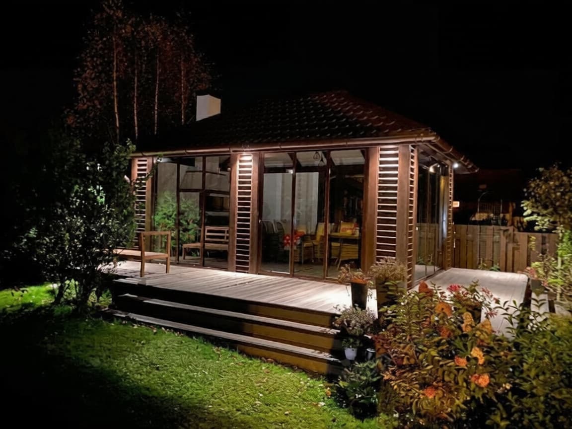 В основе конструкции — массив сосны камерной сушки и клееный брус. Технология гарантирует геометрическую стабильность строения: никакой усадки, деформаций и сквозных трещин со временем. Фундамент на винтовых сваях надежно фиксирует строение даже на участках со сложным рельефом, а цокольная часть эстетично скрыта декоративной доской в едином ансамбле с напольным покрытием.