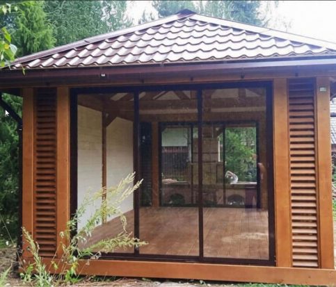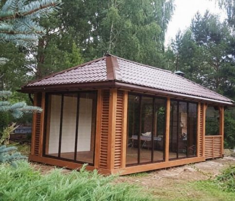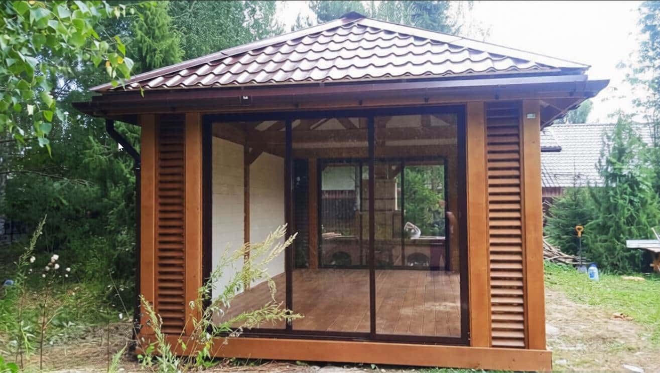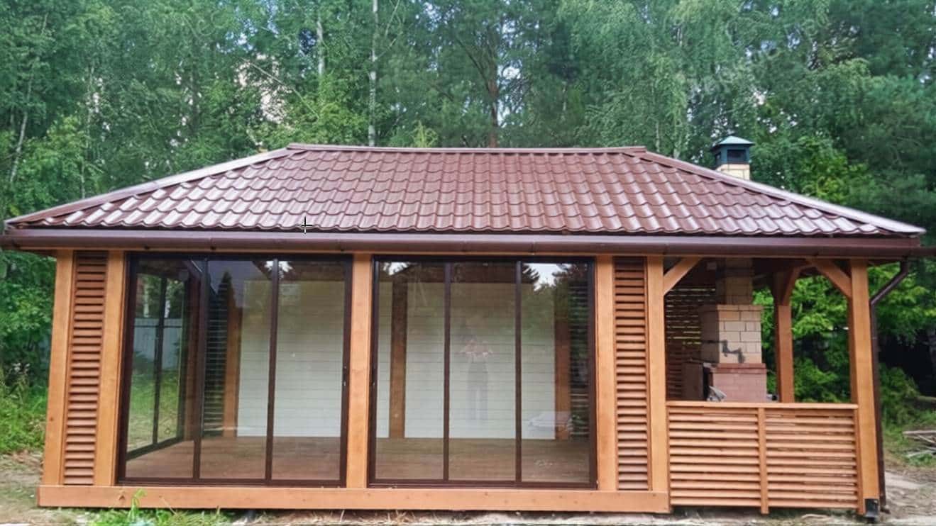 Беседка закрытая с остеклением и открытой зоной барбекю 2613