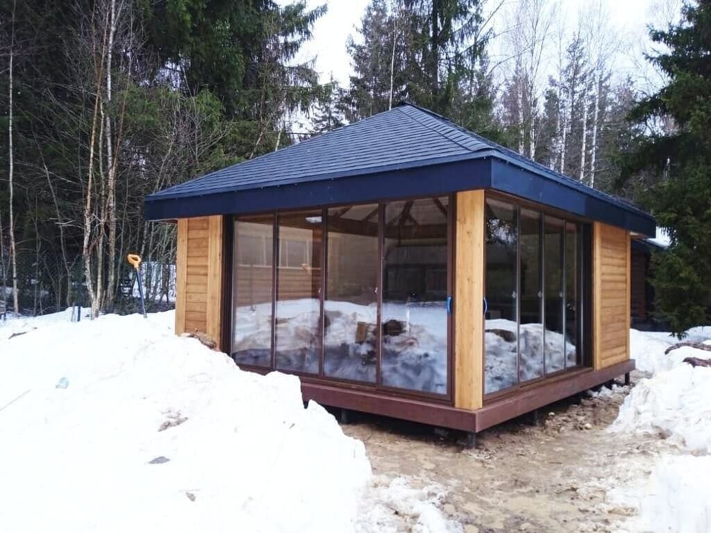 - Варианты кровли: мягкая черепица, монолитный поликарбонат, стекло.