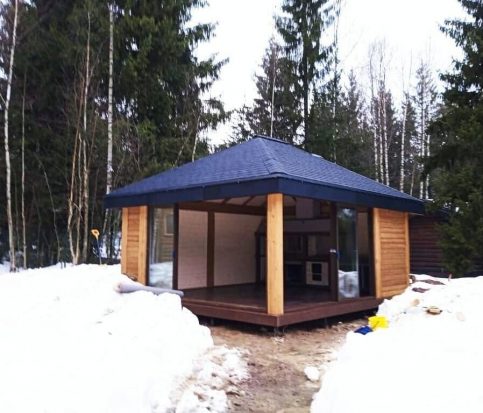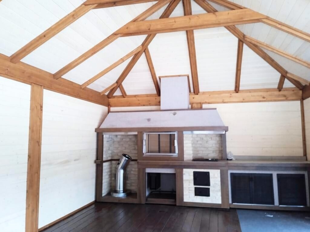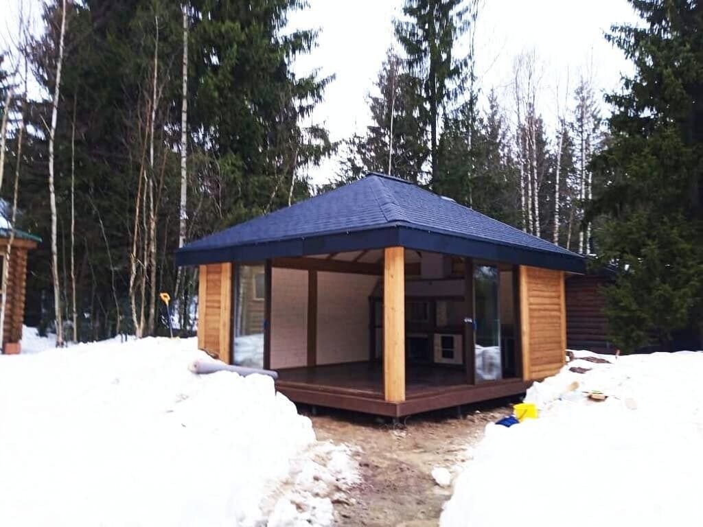 Кровля выполнена из премиальной мягкой черепицы «Shinglas». Это не только эстетика многослойного покрытия и широкий выбор оттенков, но и абсолютная бесшумность во время дождя, а также высочайшая степень гидроизоляции. По вашему желанию мы можем заменить материал кровли на поликарбонат или стекло, если вы хотите добавить в беседку еще больше света.