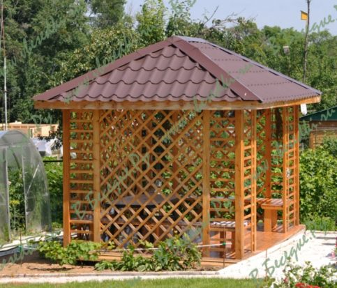Формой беседки является квадрат и она оригинальна, удобна и красива.