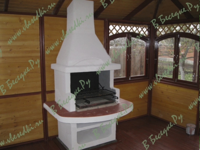 Пол беседки сделан из толстой и крепкой шпунтованной доски камерной сушки. На небольшом парапете установлен барбекю. В отличии от других производителей беседок, полы мы всегда включаем в стоимость беседки при поставке заказчику.