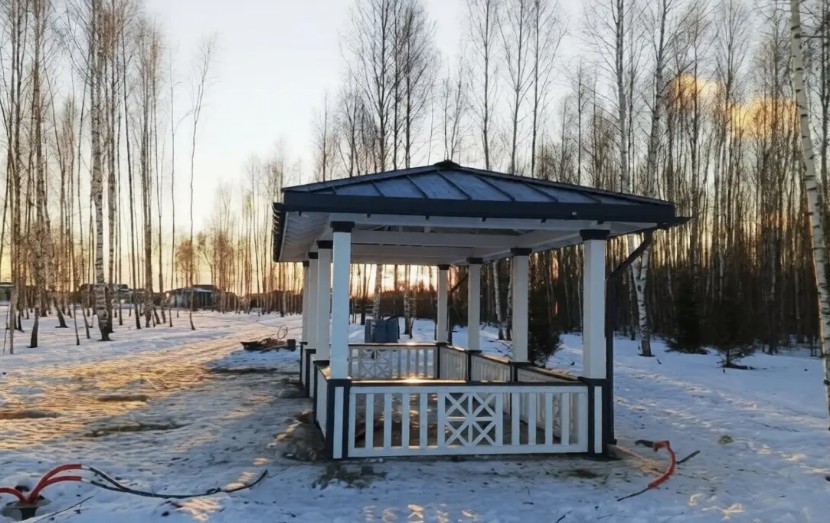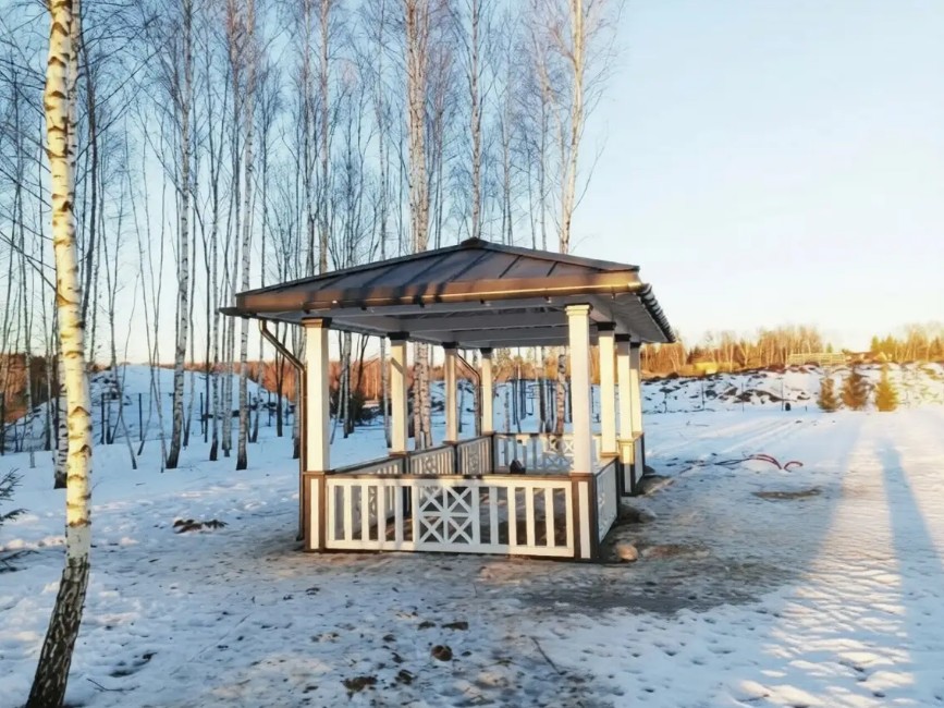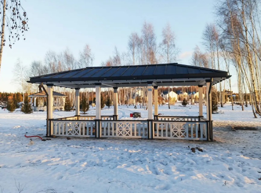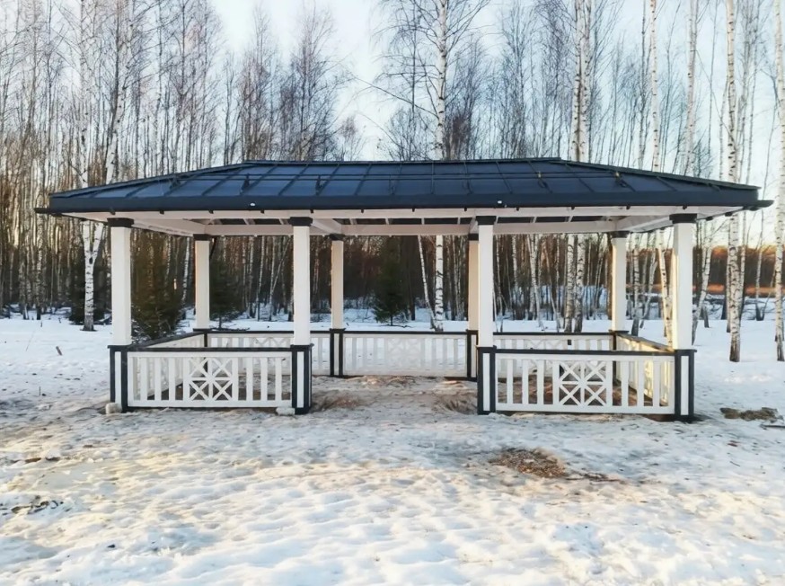 Беседка большая открытая 2624 — это решение для тех, кто ценит простор, основательность и свободу. Благодаря открытой нижней части конструкция не загромождает участок и не создаёт эффекта закрытого павильона. Вы остаётесь на природе, но при этом надёжно защищены от дождя, ветра и яркого солнца. Такая беседка становится естественным центром загородной жизни: здесь удобно принимать гостей, устраивать длинные ужины или просто отдыхать с книгой в тени.