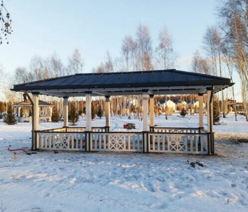 Беседка большая открытая 2624 спроектирована с возможностью гибкой настройки под ваши задачи. Вы можете изменить любые размеры изделия, увеличить сечение стоек до 200х200 или даже 250х250 мм, заказать беседку из лиственницы. Также доступны другие типы кровли: мягкая черепица, поликарбонат или остекление. Высокая крыша с большим куполом не только эффектно смотрится, но и позволяет удобно провести освещение — можно повесить тяжёлую люстру или гирлянды.