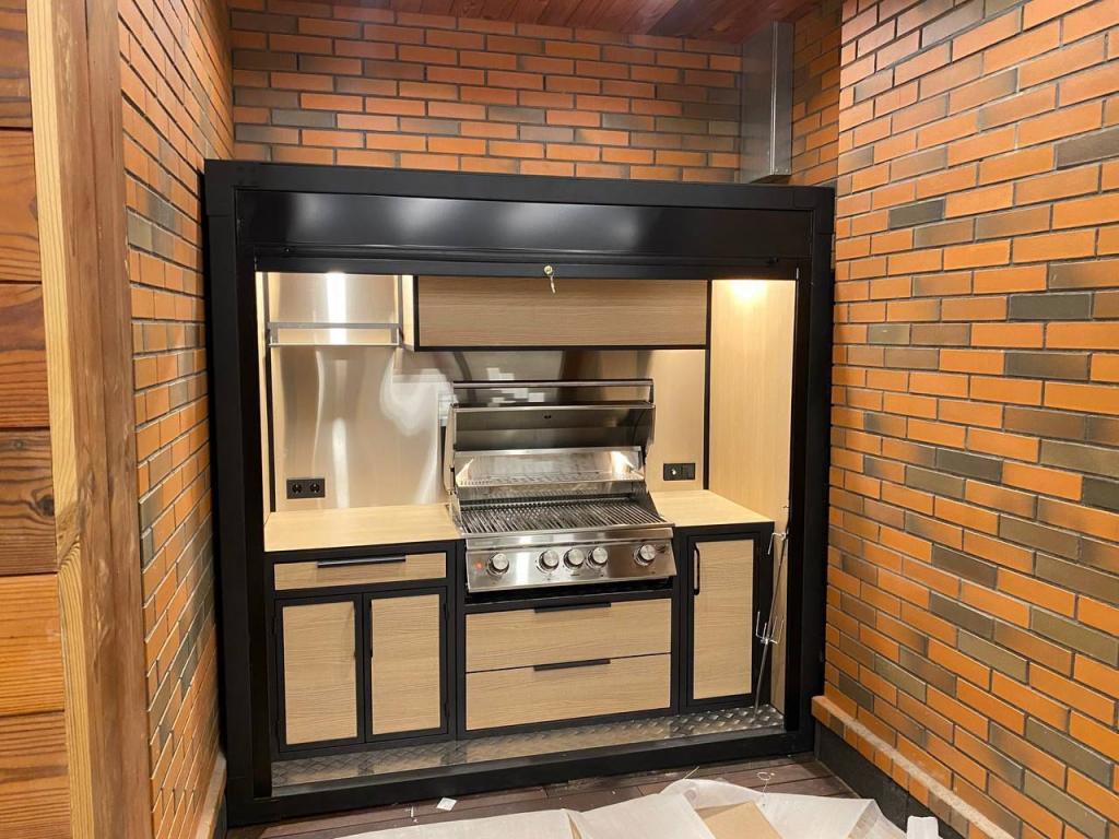 Печь выполнена из прочного и долговечного материала – стали (цвет «сталь»), что обеспечивает надежность, устойчивость к атмосферным воздействиям и долгий срок службы. Декоративное исполнение из массива дерева (порода на ваш выбор) придает комплексу эстетичный вид, который гармонично впишется в любой ландшафтный дизайн.