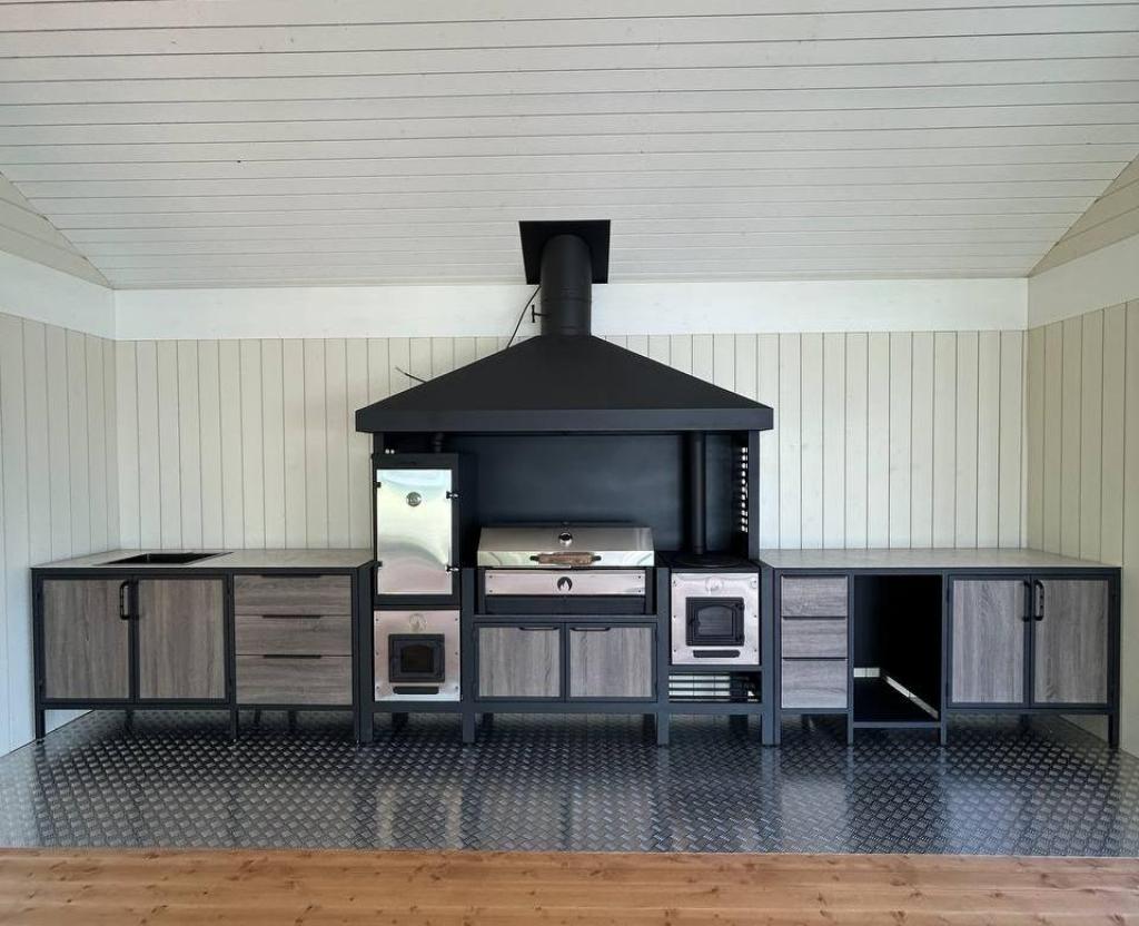 Модульная система позволяет адаптировать печь под ваши задачи: большие рабочие столы дают достаточно места для подготовки продуктов, а встроенная коптильня порадует вас блюдами горячего и холодного копчения.