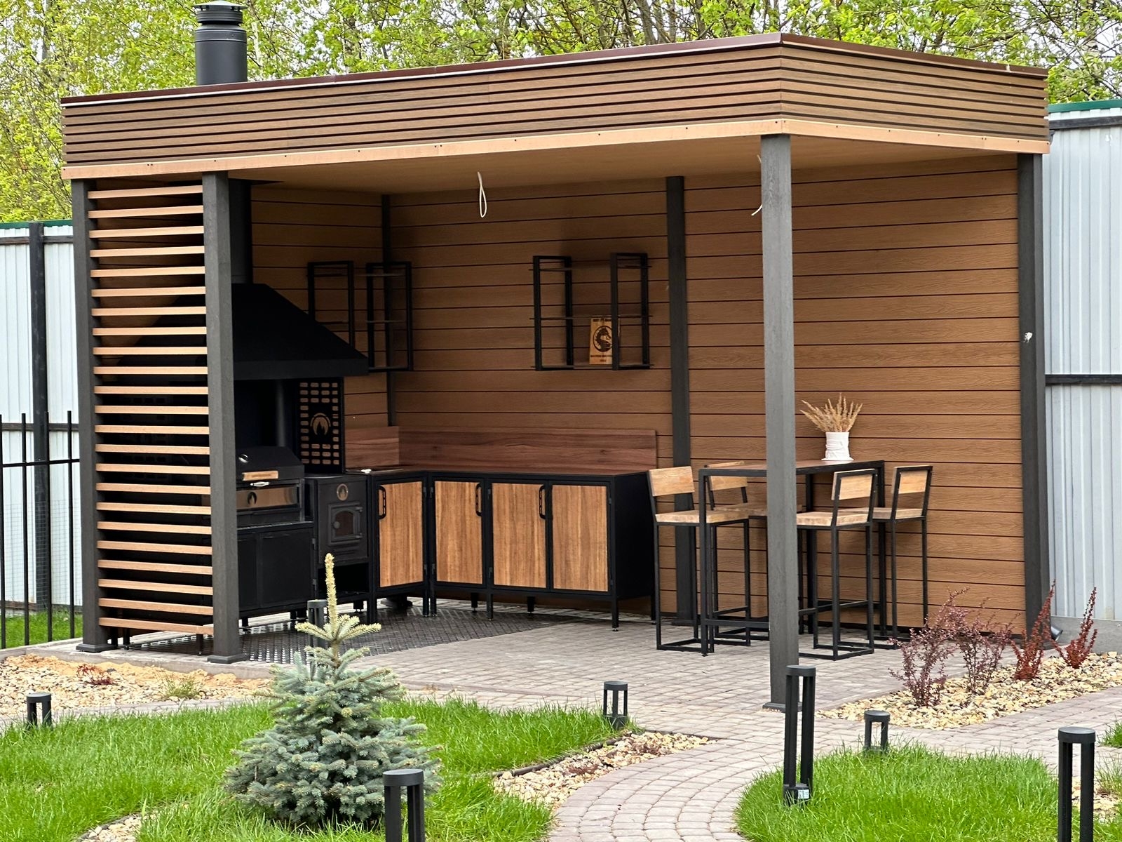 Размеры комплекса — 150×60 см. Возможны изменения под заказ. Конструкция выполнена из прочного металла. Основание, стены и несущие конструкции металлические. Декоративные элементы из массива дерева на ваш выбор придают комплексу эстетичный вид, который гармонично впишется в любой ландшафтный дизайн. Фундамент — винтовые сваи, входит в комплектацию.