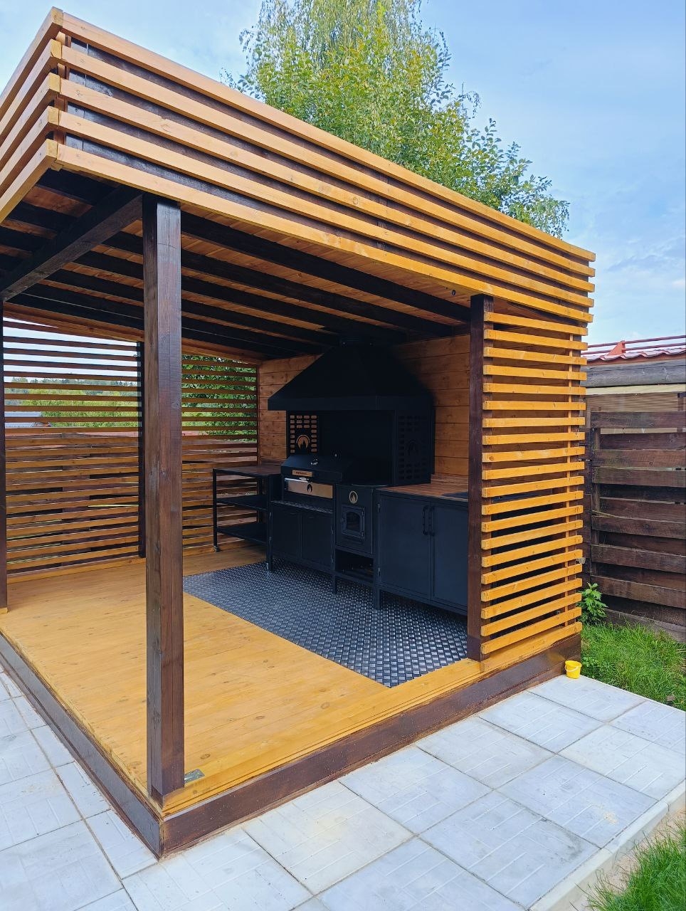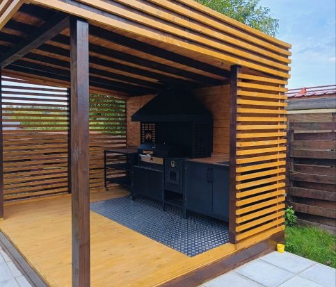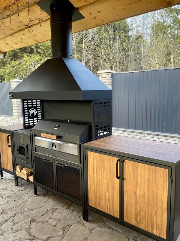 Просторные стеллажи и отсеки для хранения – удобно разместить дрова, уголь, шампуры, решётки и другую кухонную утварь. Всё необходимое всегда под рукой.