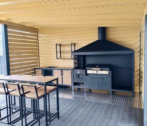 Эксклюзивная печь-барбекю GastroFlame 5014 – это уличный кулинарный комплекс с барной стойкой, созданный для тех, кто любит готовить в компании. Модель объединяет мангал, просторную рабочую зону и высокий барный стол, за которым удобно стоять и общаться с гостями во время приготовления блюд. Размер комплекса – 120×60 см.