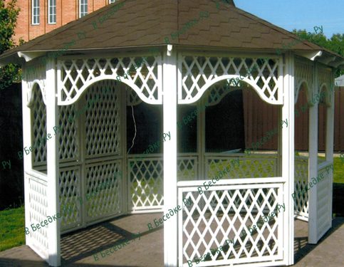 Формой беседки является шестиугольник и она оригинальна, удобна и красива.