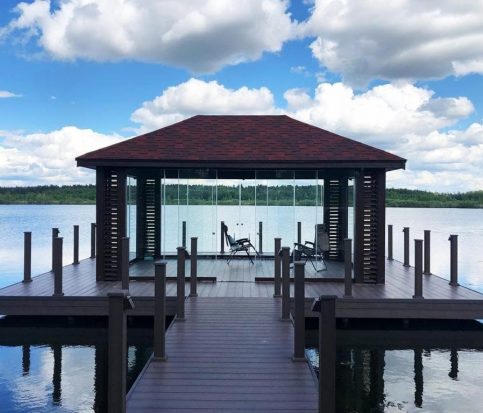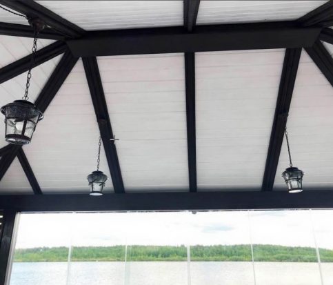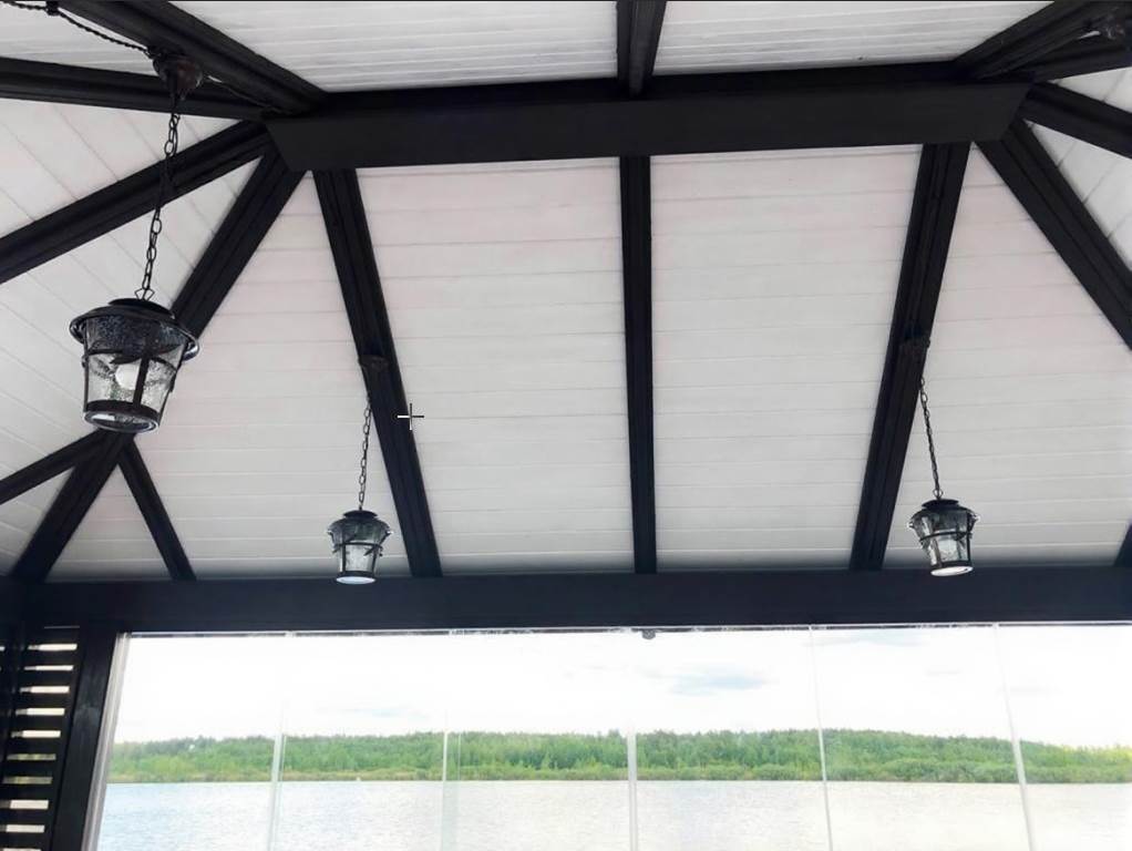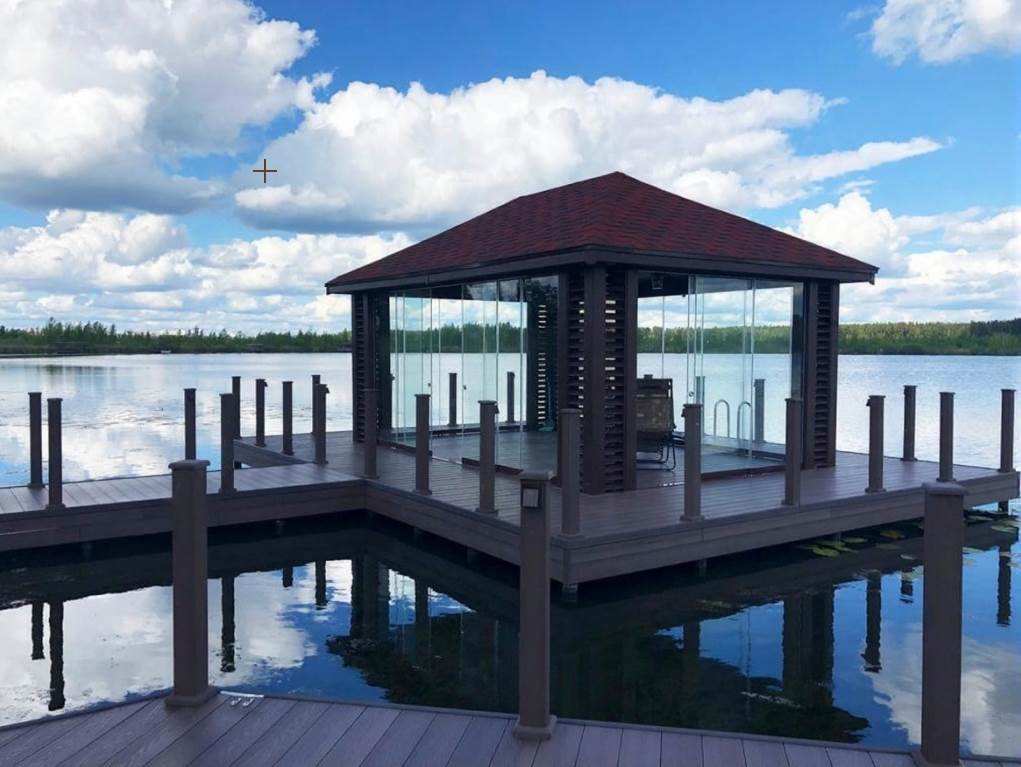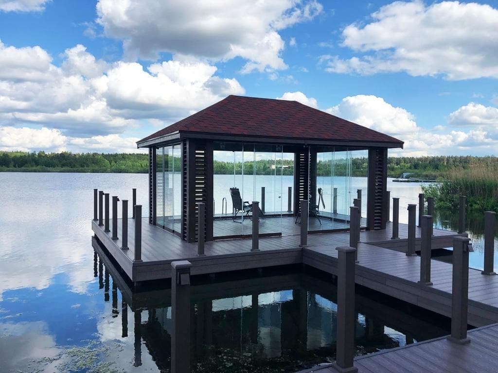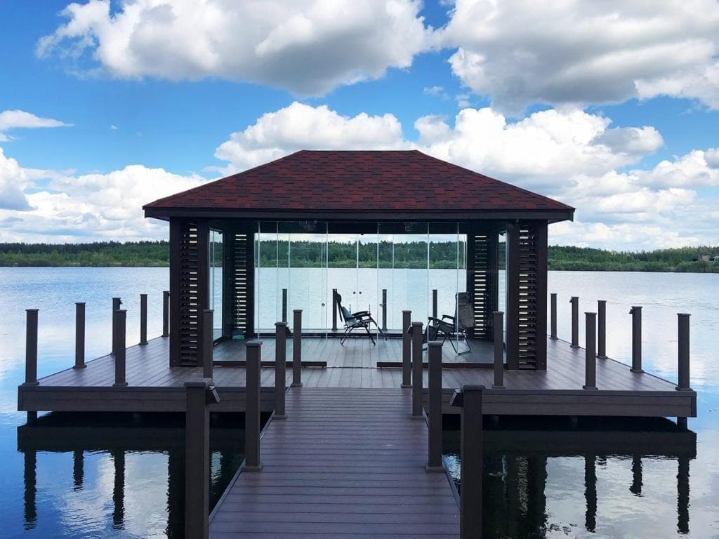 Главное украшение модели 2612 — полное панорамное остекление. Оно превращает интерьер в светлую гостиную с обзором 360 градусов, открывающим захватывающие виды на воду и ландшафт. В закрытом состоянии остекление герметично защищает от ветра, дождя и пыли, делая беседку пригодной для круглогодичной эксплуатации.